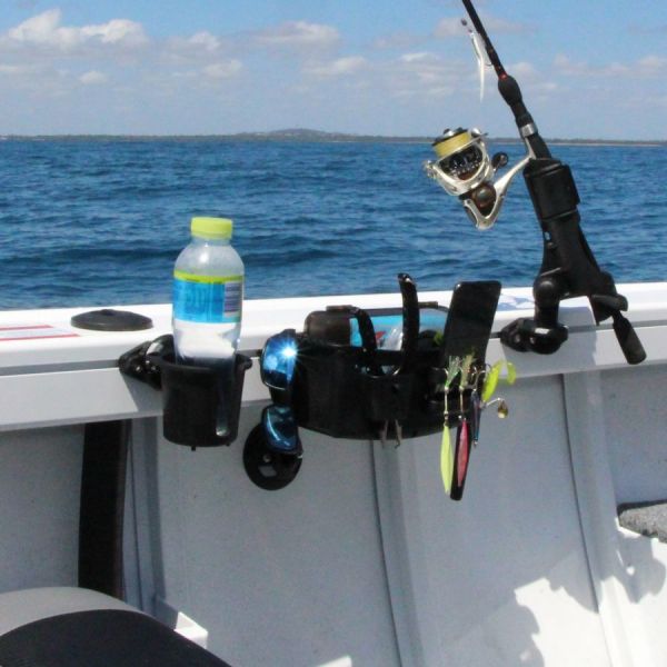 Cette base de montage permet d'installer sans outil des accessoires sur les rails de plat-bord de la plupart des bateaux de pêche en aluminium, notamment :
